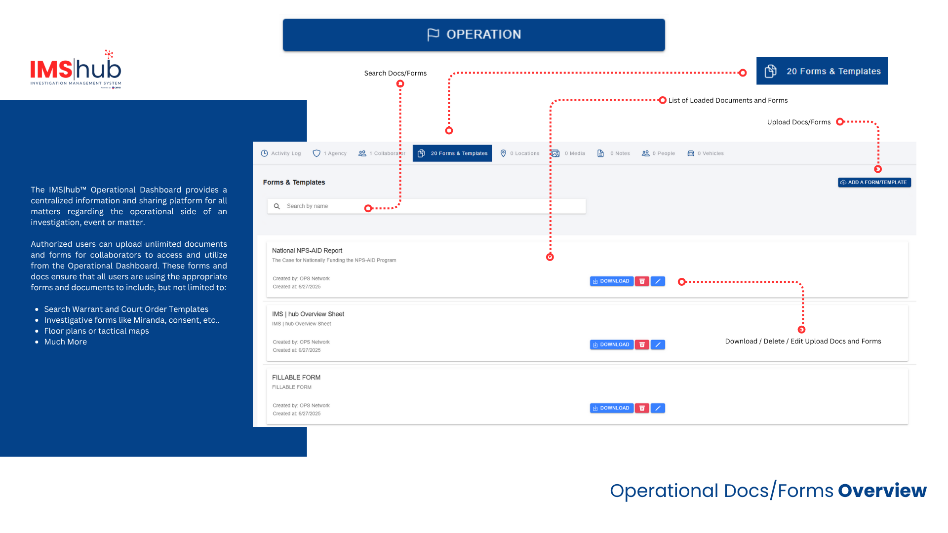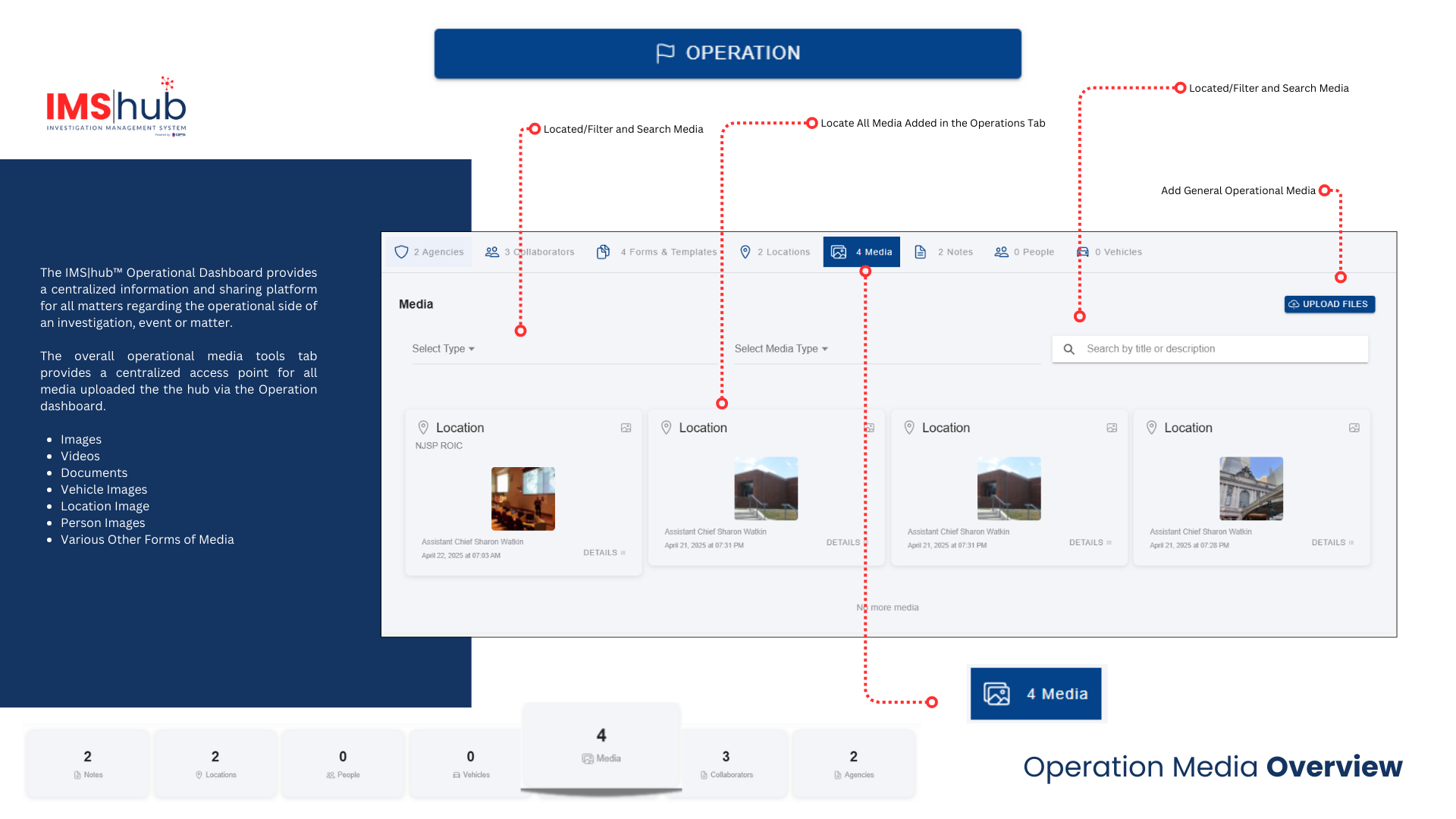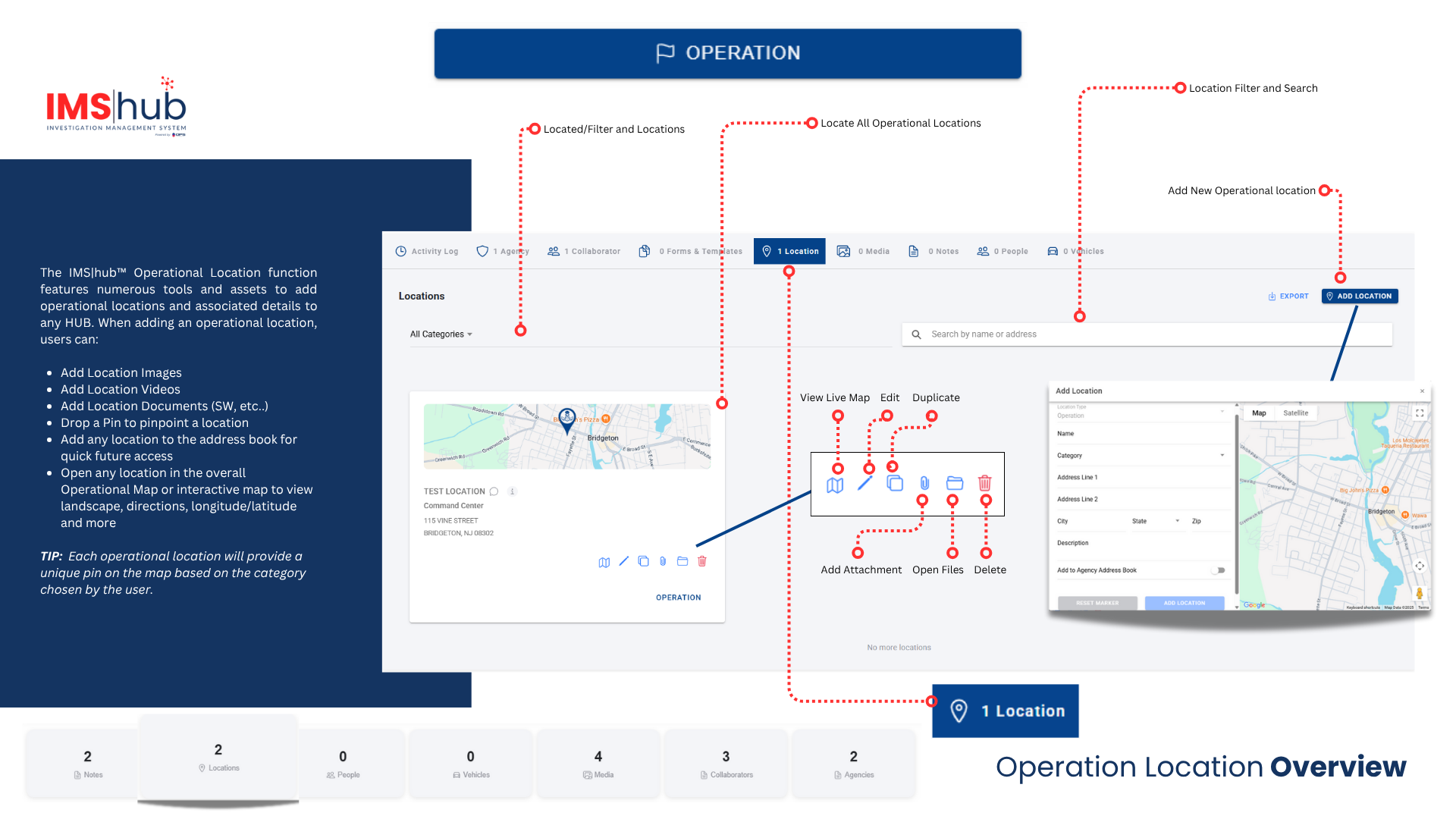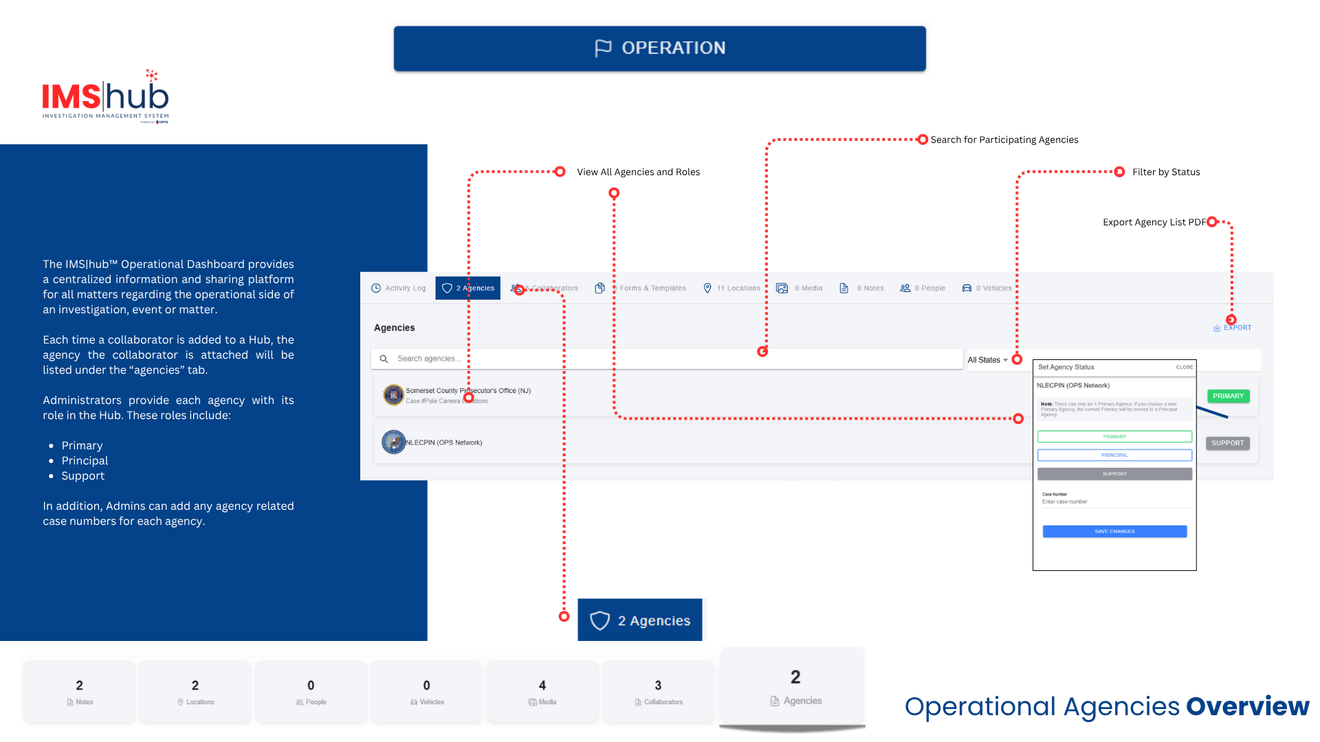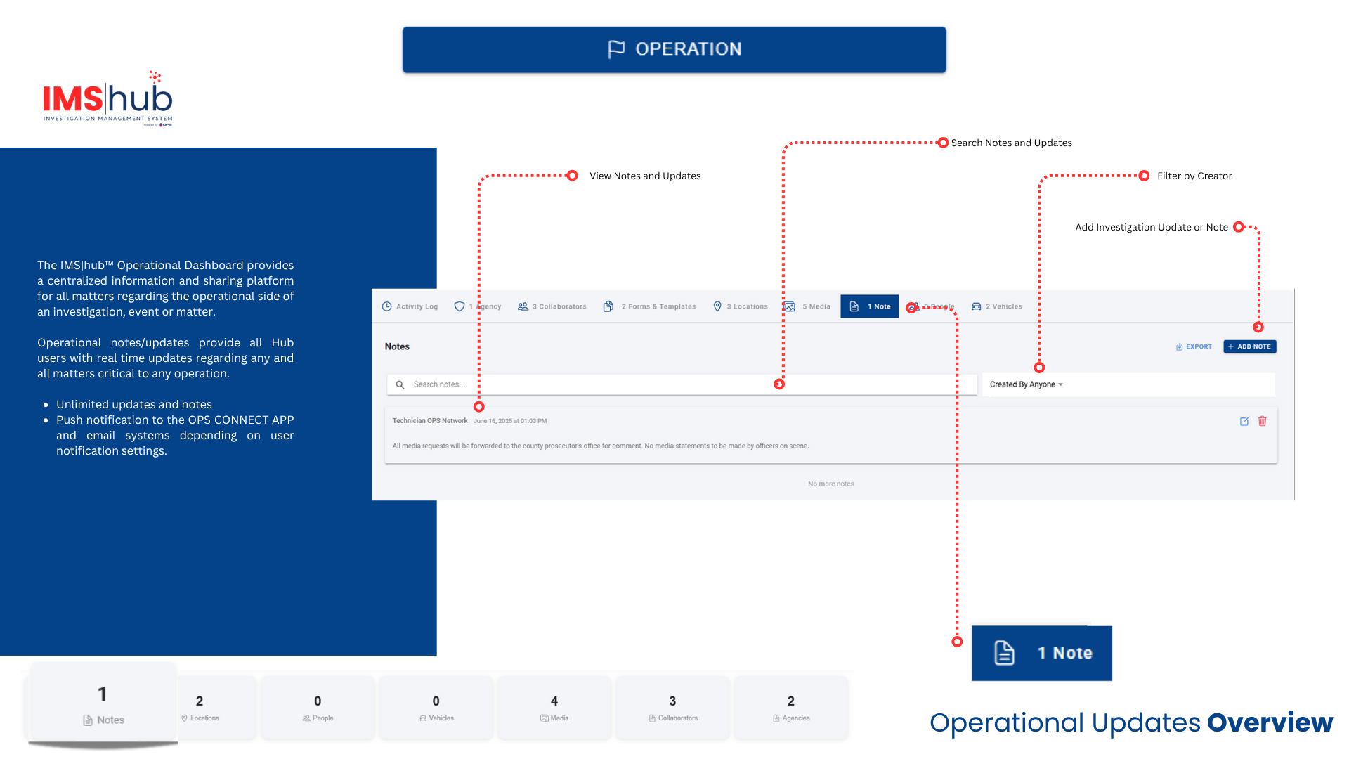 The IMS|hub™ Operational Dashboard provides a centralized information and sharing platform for all matters regarding the operational side of an investigation, event or matter.