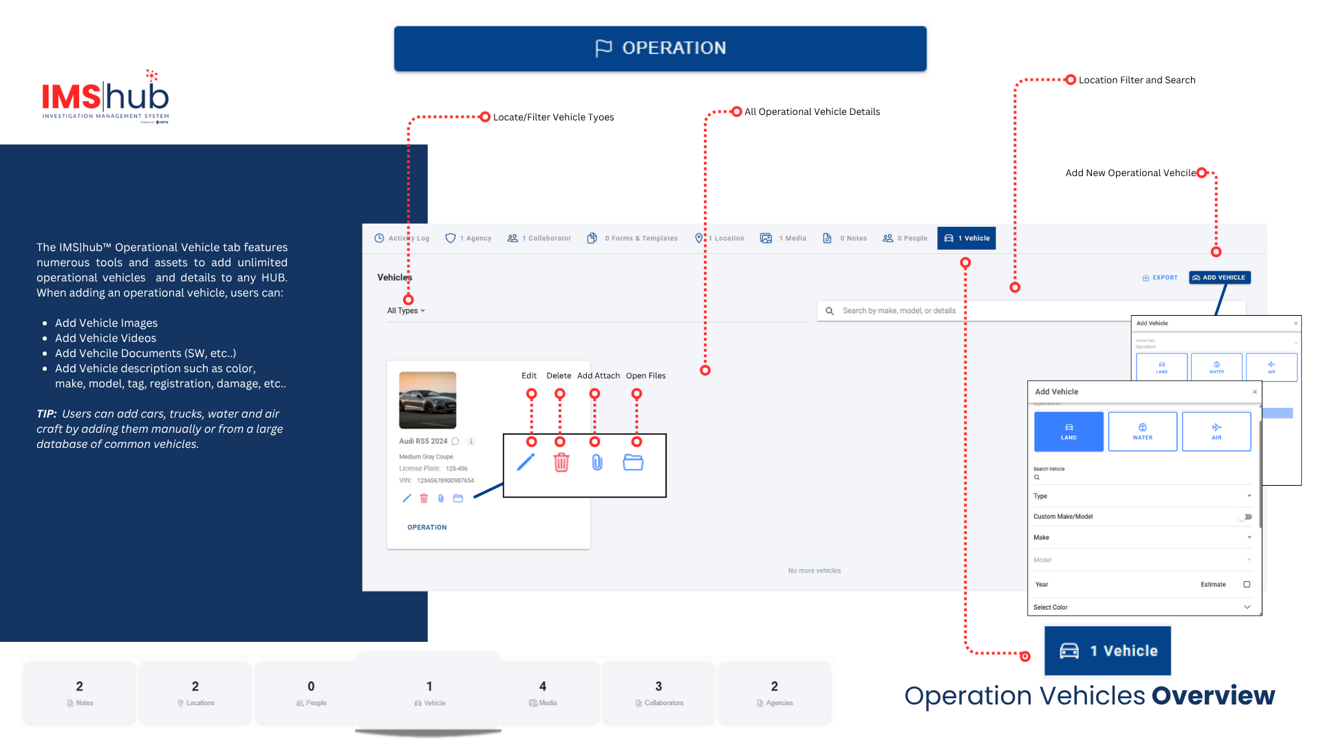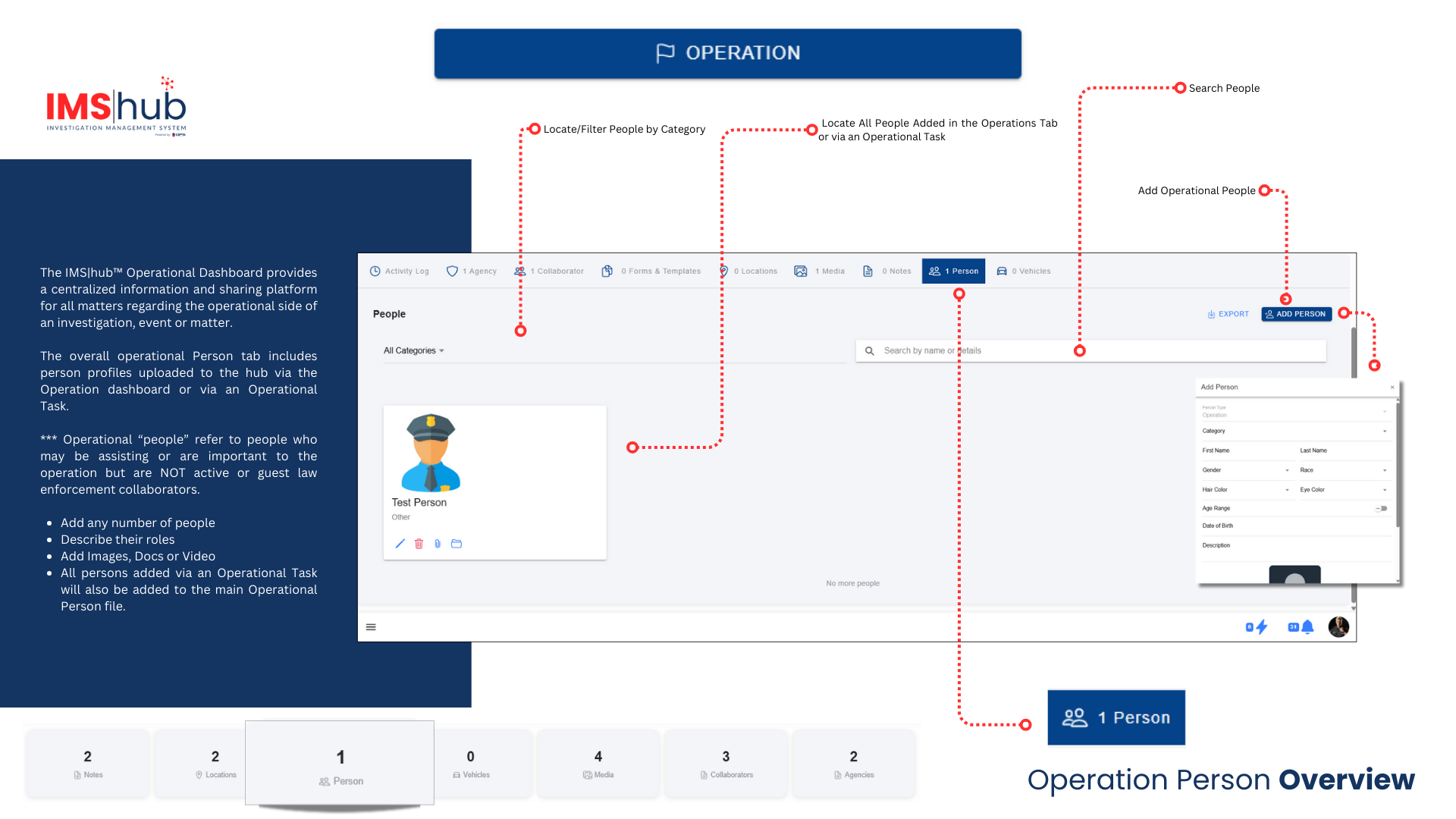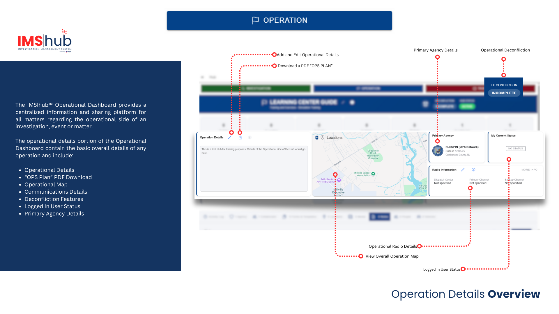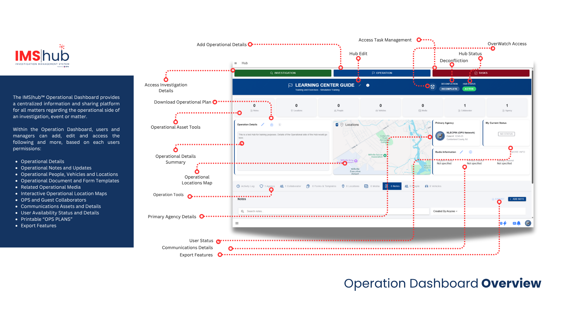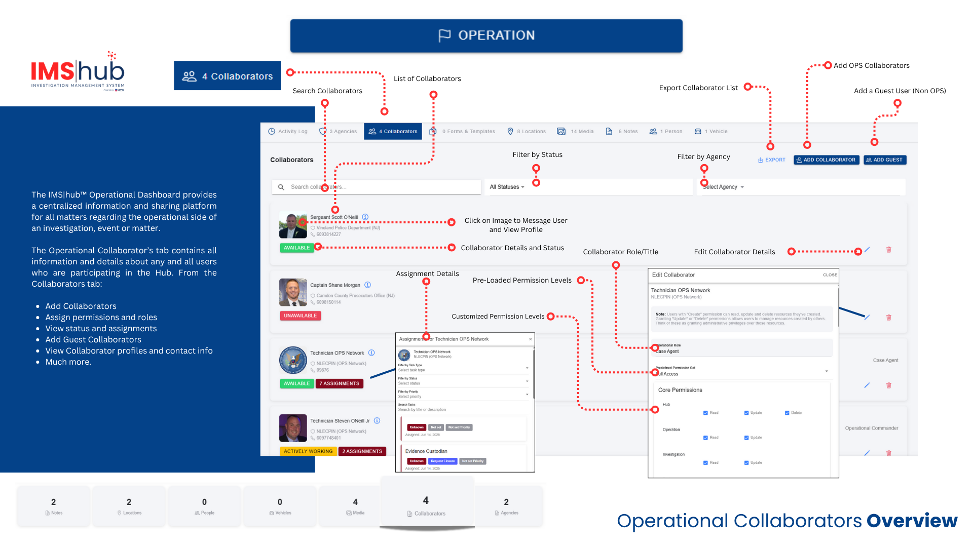 Operational Details, Operational Notes and Updates, Operational People, Vehicles and Locations, Operational Document and Form Templates, Related Operational Media, Interactive Operational Location Maps, OPS and Guest Collaborators, Communications Assets and Details, User Availability Status and Details, Export Features
