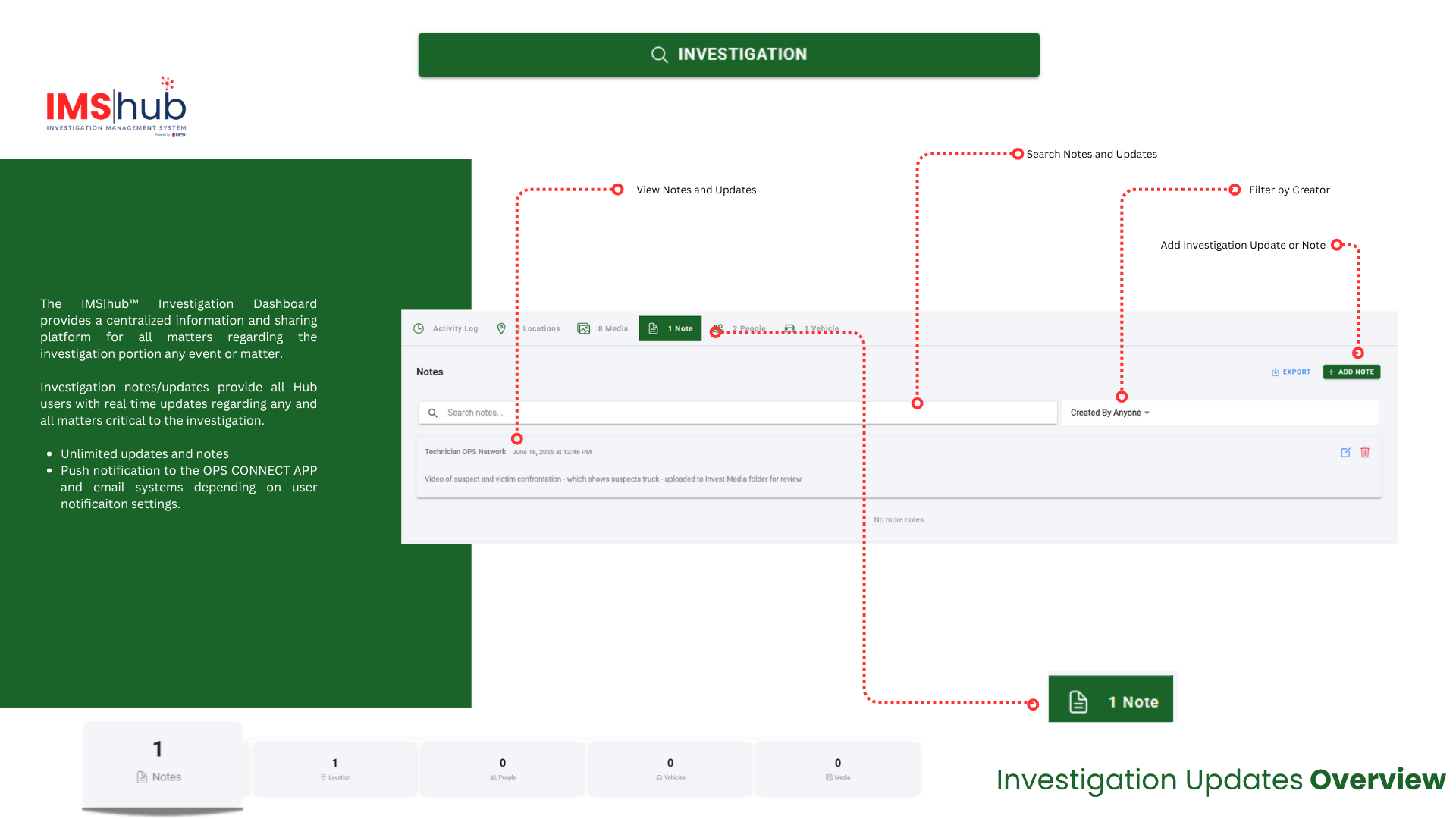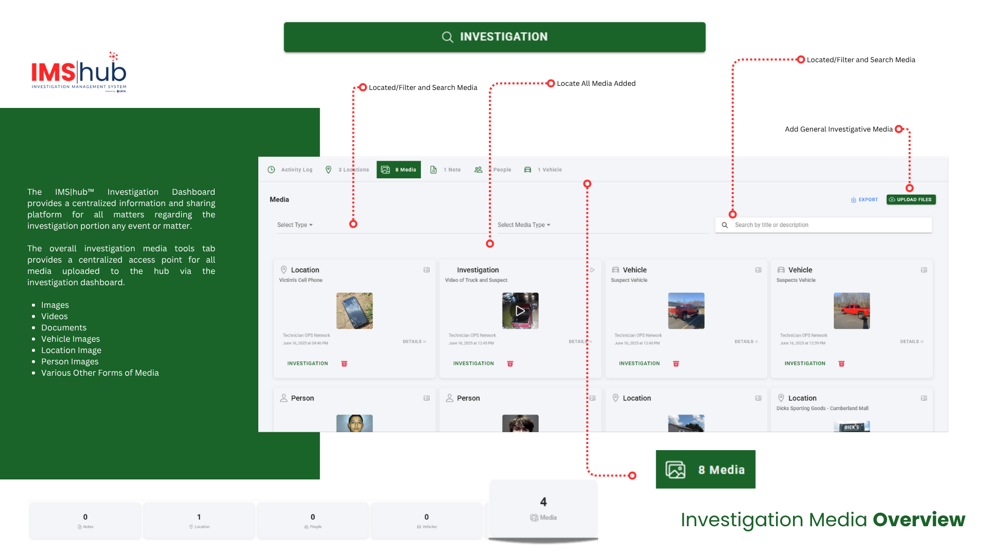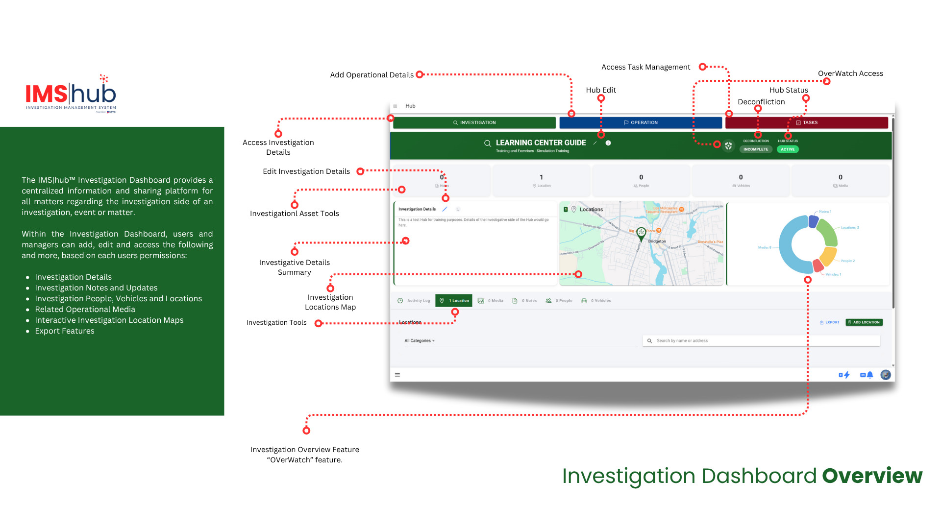 The IMS|hub™ Investigation Dashboard provides a centralized information and sharing platform for all matters regarding the investigatonal side of any investigation, event or matter.