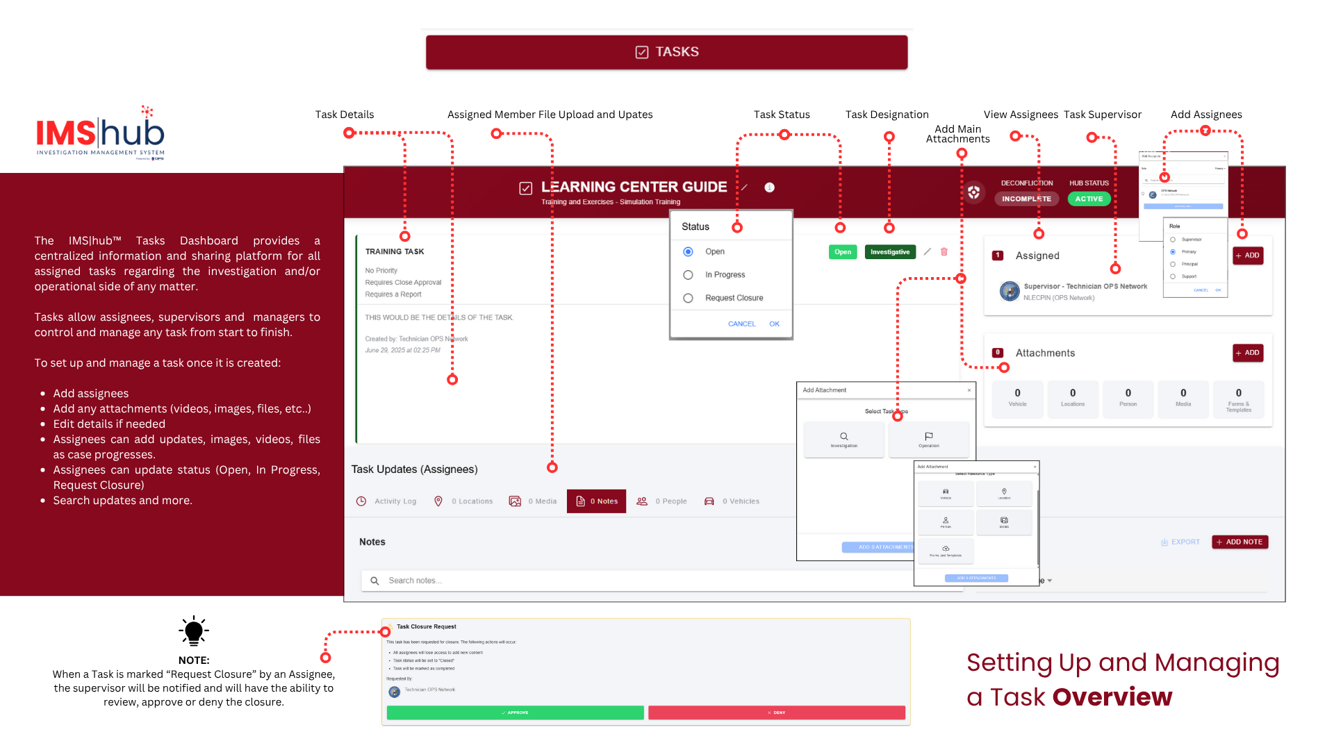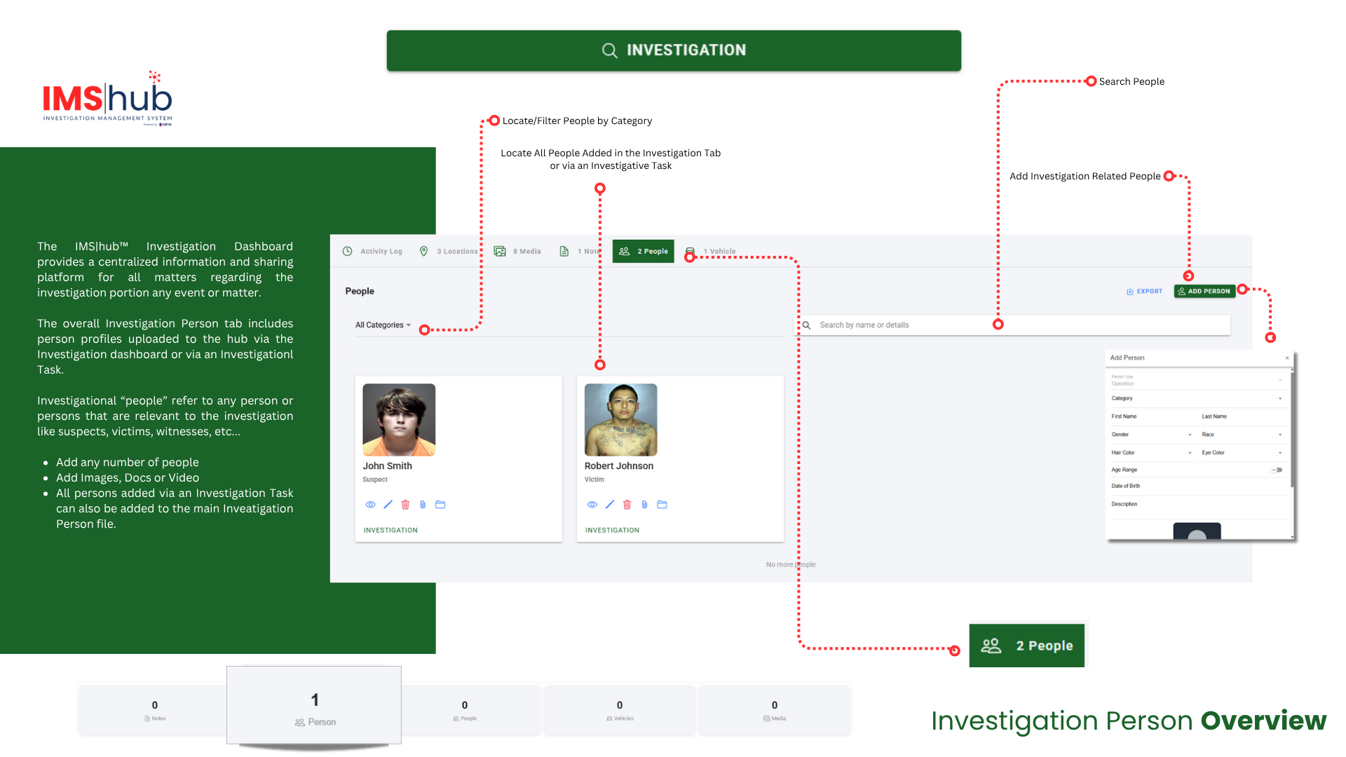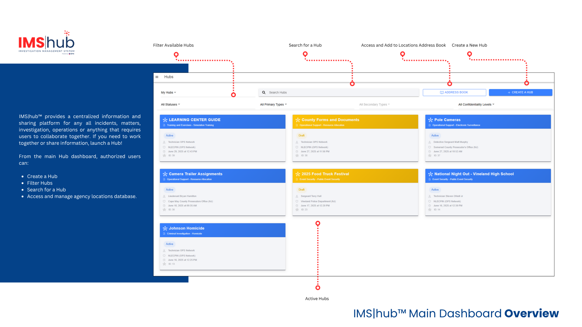 The IMS|hub™ Investigation Dashboard provides a centralized information and sharing platform for all matters regarding the investigatonal side of any investigation, event or matter.