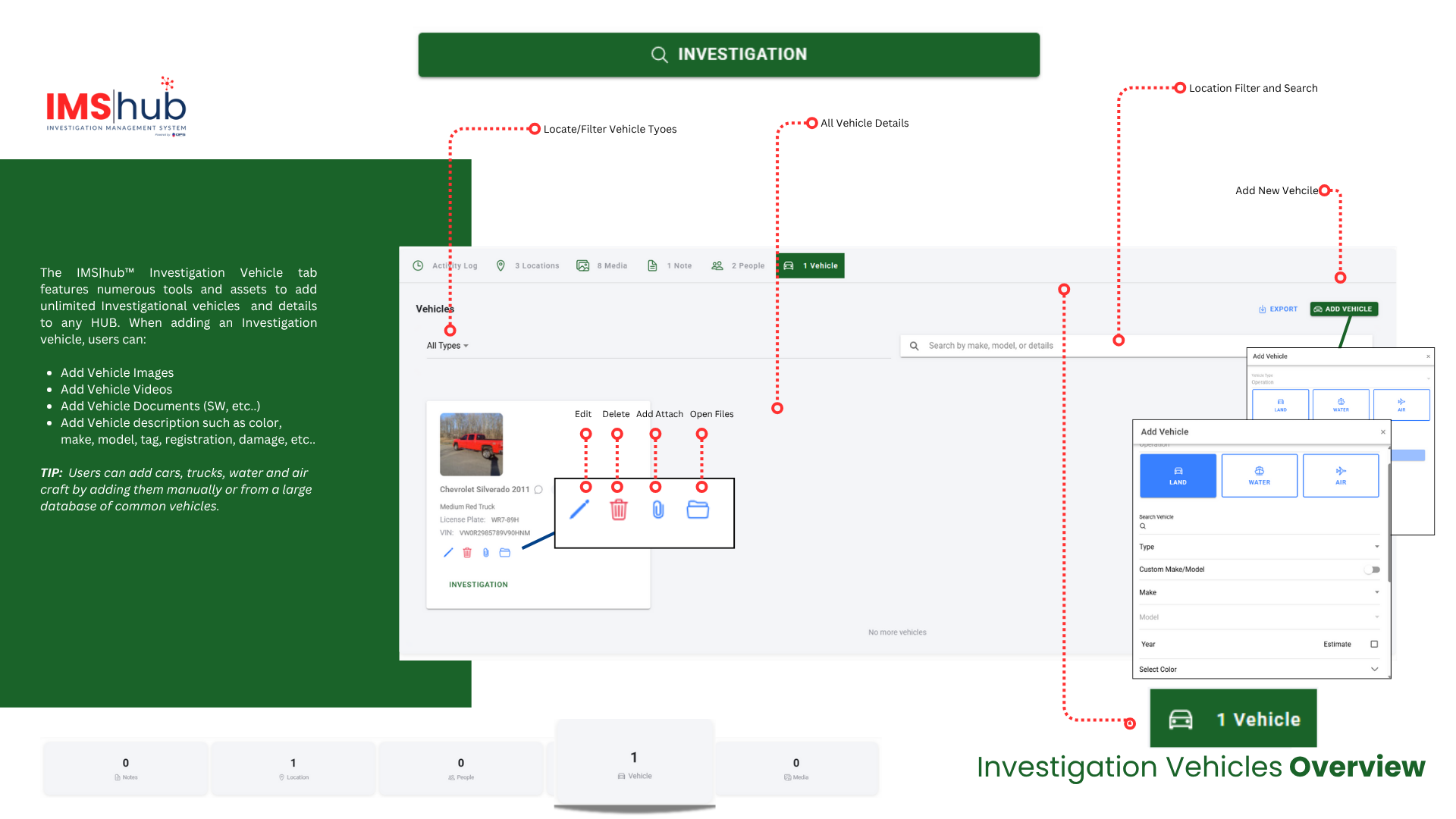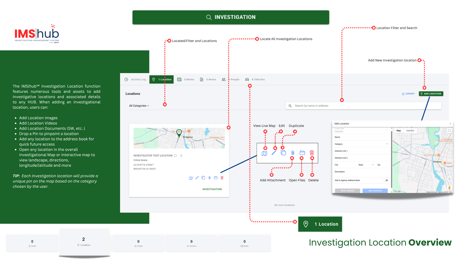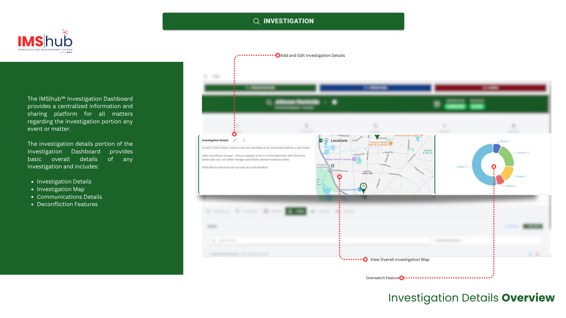 Investigation Details, Notes and Updates, People, Vehicles and Locations, Related Investigation Media, Interactive Investigation Locations, Maps and more.