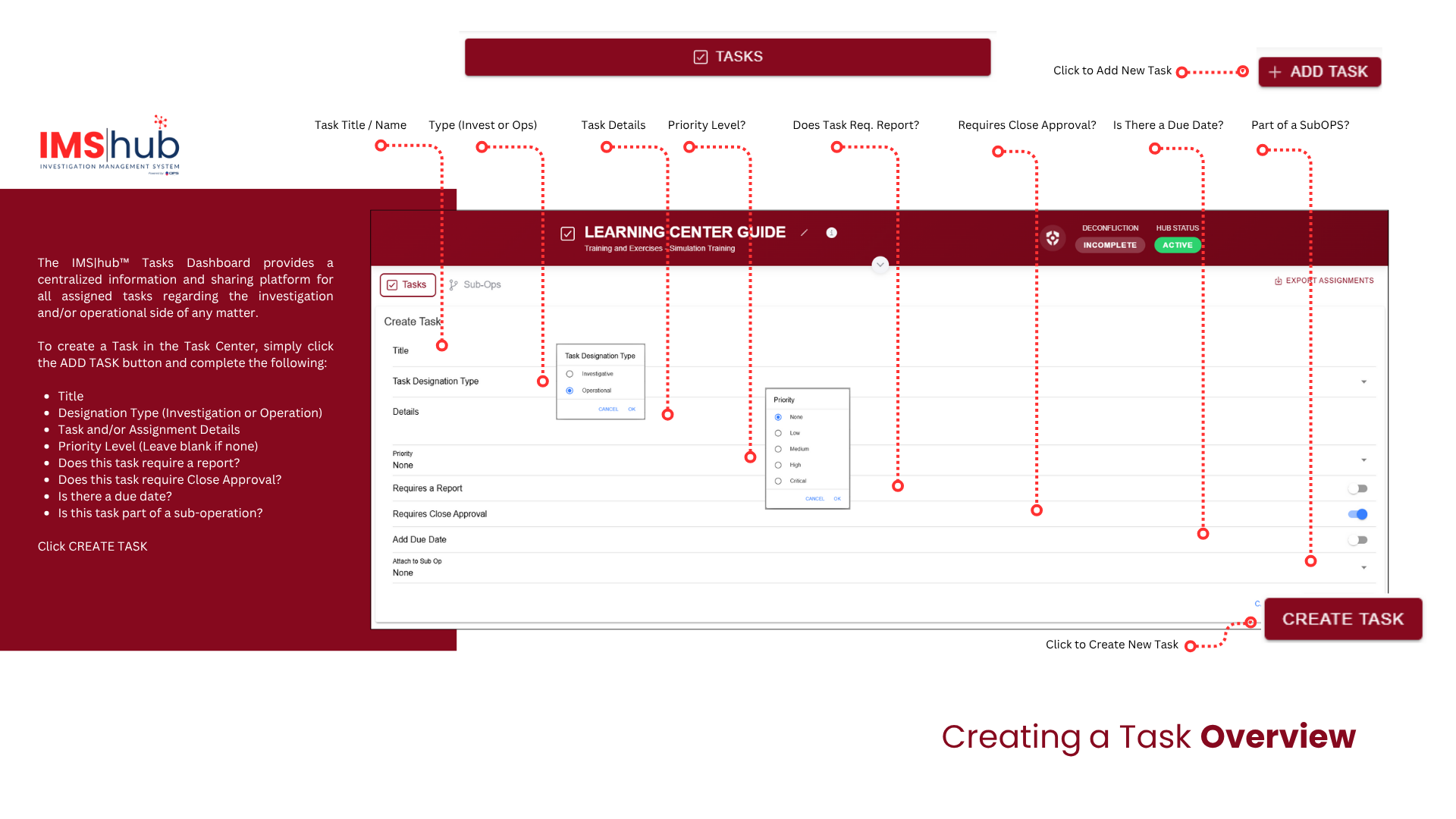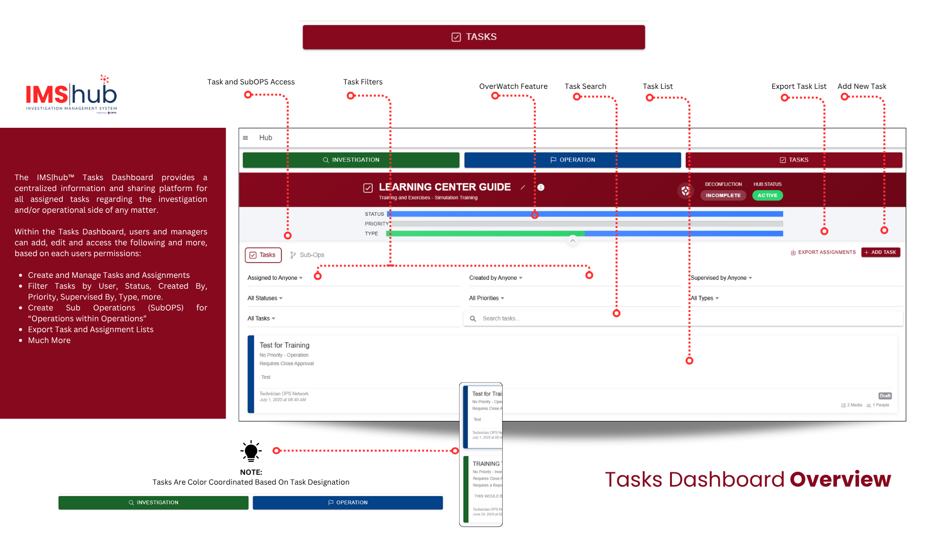 The IMS|hub™ Tasks Dashboard provides a centralized information and sharing platform for all tasks and assignments regarding the operational and/or investigation side of any matter.