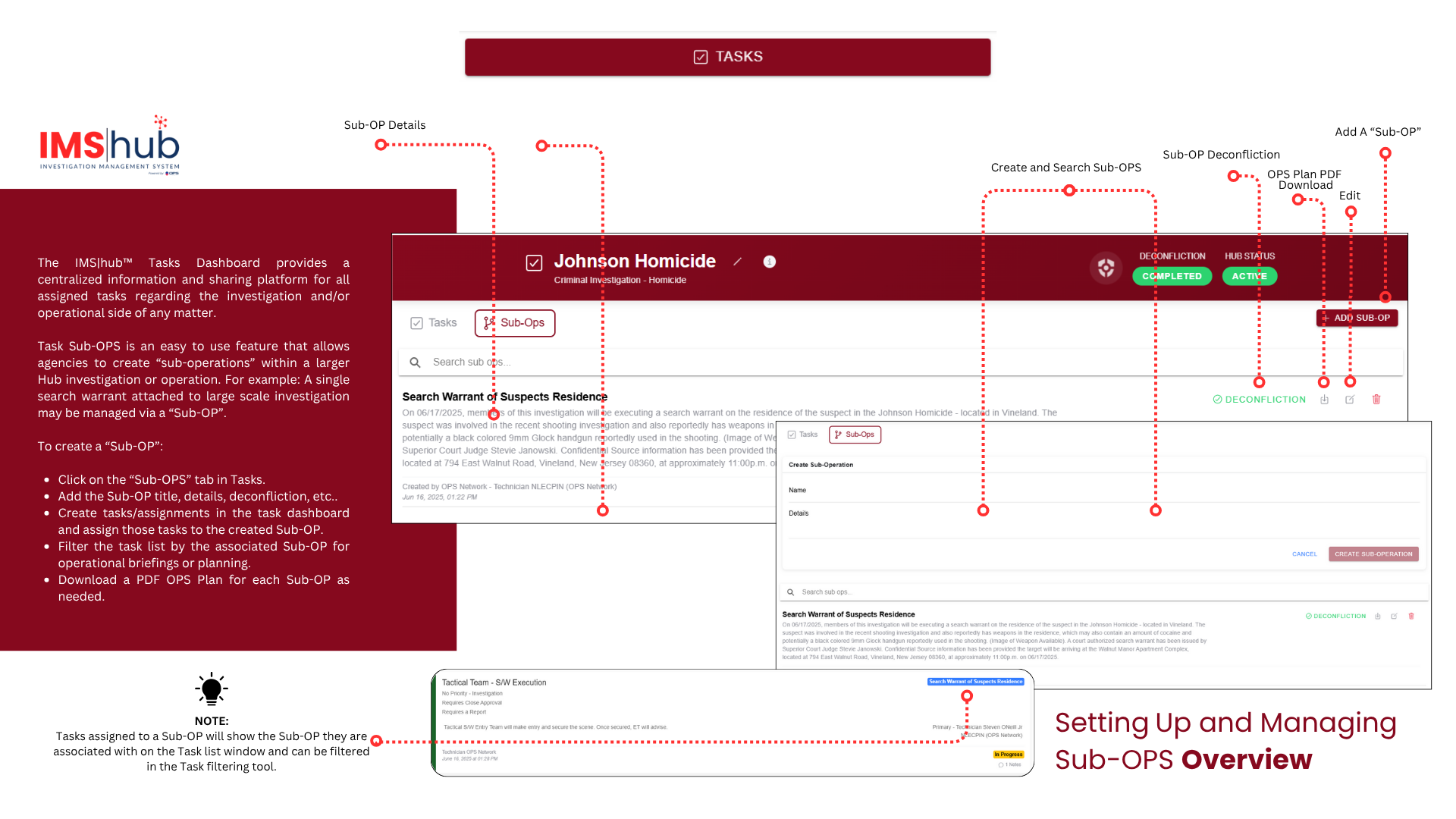 The “Sub-OP” feature of IMS|hub works differently and is provided as a way to manage Operations within larger Operations. For example: If an agency is running a long term investigation into a criminal matter, they may execute numerous sub-operations such as individual search warrants, arrest warrants, etc.. that all will be part of the larger Operation managed within the Hub. In this case, “Sub-OPS” can be activated and executed within the overall Hub, creating individual OPS Plans.